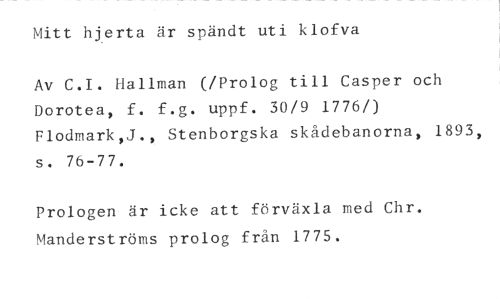 Mitt hjerta är spändt uti klofva //// Av C.I. Hallman (/Prolog till Casper och Dorotea, f. f.g. uppf. 30/9 1776/) Flodmark,J., Stenborgska skådebanorna, 1893, s. 76-77. //// Prologen är icke att förväxla med Chr. Manderströms prolog från 1775.