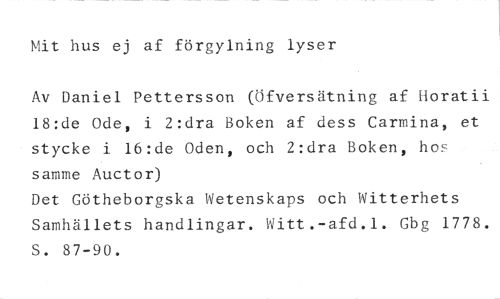 Mit hus ej af förgylning lyser //// Av Daniel Pettersson (Öfversätning af Horatii 18:de Ode, i 2:dra Boken af dess Carmina, et stycke i 16:de Oden, och 2:dra Boken, hos samme Auctor) //// Det Götheborgska Wetenskaps och Witterhets Samhällets handlingar. Witt.-afd.1. Gbg 1778. S. 87-90.