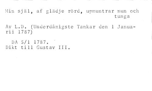 Min själ, af glädje rörd, upmuntrar mun och //// tunga //// Av L.D. (Underdånigste Tankar den 1 Januarii 1787) //// DA 5/1 1787. //// Dikt till Gustav III.