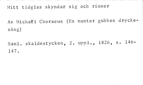 Mitt tidglas skyndar sig och rinner //// Av Michail]. Choraeus (En munter gubbes dryckesång) //// Saml. skaldestycken, 2. upp].., 1826, s. 146147.