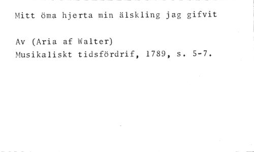 Mitt öma hjerta min älskling jag gifvit //// Av (Aria af Walter) //// Musikaliskt tidsfördrif, 1789, s. 5-7.