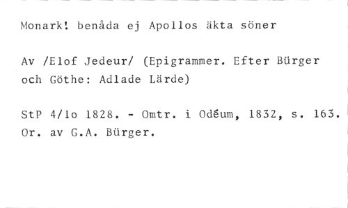 Monark: benåda ej Apollos äkta söner //// Av /Elof Jedeur/ (Epigrammen. Efter Burger och Göthe: Adlade Lärde) //// StP 4/lo 1828. - Omtr. i °deum, 1832, s. 163. Or. av G.A. Burger.
