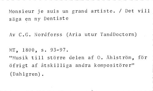 Monsieur je suis un grand artiste. / Det vill säga en ny Dentiste //// Av C.G. Nordforss (Aria utur TandDoctorn) //// MT, 1800, s. 93-97. //// "Musik till större delen af 0. Åhlström, för öfrigt af åtskilliga andra kompositörer" //// (Dahlgren).