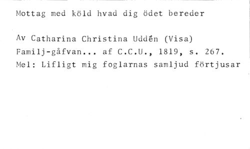 Mottag med köld hvad dig ödet bereder //// Av Catharina Christina Udden (Visa) Familj-gåfvan... af C.C.U., 1819, s. 267. Mel: Lifligt mig foglarnas samljud förtjusar
