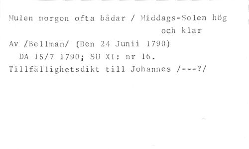 Mulen morgon ofta bådar / Middags-Solen hög //// och klar //// Av /Bellman/ (Den 24 Junii 1790) //// DA 15/7 1790; SU XI: nr 16. //// Tillfällighetsdikt till Johannes /---? //// /