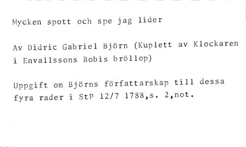 Mycken spott och spe jag lider //// Av Didric Gabriel Björn (Kuplett av Klockaren i Envallssons Bobis bröllop) //// Uppgift om Björns författarskap till dessa fyra rader i StP 12/7 1788,s. 2,not.