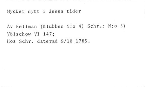 Mycket nytt i dessa tider //// Av Bellman (Klubben N:o 4) Schr.: N:o 5) Völschow VI 147; //// Hos Schr. daterad 9/10 1785.