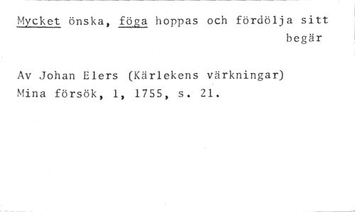 Mycket önska, föga hoppas och fördölja sitt //// begär //// Av Johan Elers (Kärlekens värkningar) Mina försök, 1, 1755, s. 21.