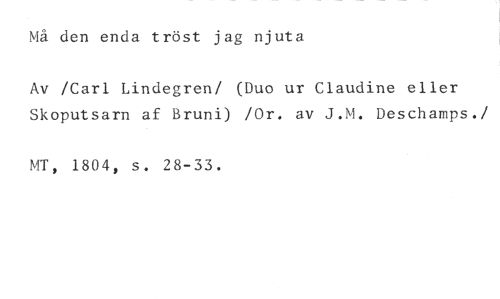 Må den enda tröst jag njuta //// Av /Carl Lindegren/ (Duo ur Claudine eller Skoputsarn af Bruni) /Or. av J.M. Deschamps. //// /MT, 1804, s. 28-33.