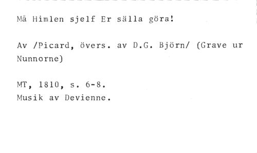 Må Himlen sjelf Er sälla göra! //// Av /Picard, övers. av D.G. Björn/ (Grave ur Nunnorne) //// MT, 1810, s. 6-8. Musik av Devienne.