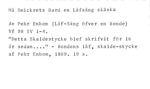 Må Smickrets Bard en Låfsång skänka //// Av Pehr Enbom (Låf-Sång öfver en Bonde) Vf 98 IV 1-4. //// "Detta Skaldestycke blef skrifvit för 16 år sedan...." - Bondens låf, skalde-stycke af Pehr Enbom, 1809. 19 s.