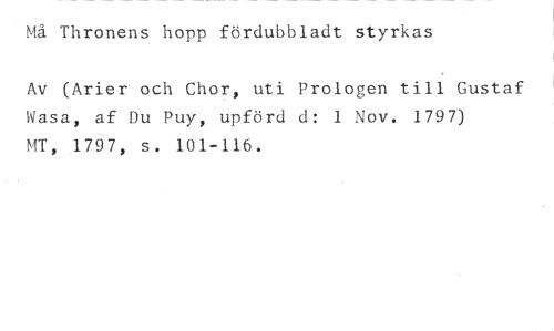 Må Thronens hopp fördubbladt styrkas //// Av (Arier och Chor, uti Prologen till Gustaf Wasa, af Du Puy, upförd d: 1 Nov. 1797) MT, 1797, s. 101-116.