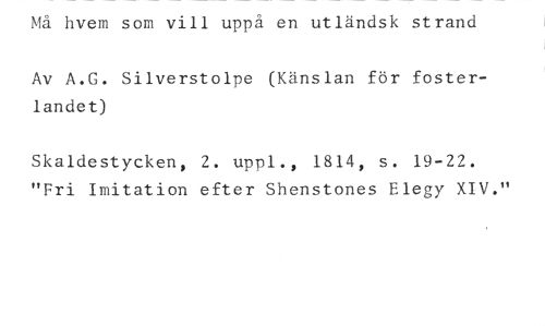 Må hvem som vill uppå en utländsk strand //// Av A.G. Silverstolpe (Känslan för fosterlandet) //// Skaldestycken, 2. uppi., 1814, s. 19-22. "Fri Imitation efter Shenstones Elegy XIV."