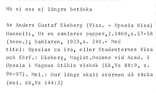 Må vi oss ej längre betänka //// Av Anders Gustaf Ekeberg (Visa. - Upsala Wisa) Hanselli, Ur en samlares papper,2.1869,s.57-58 (Anon.); Samlaren, 1923,s. 240.- Med //// titel: Upsalas ca ira, eller Studenternes Visa och förf.: Ekeberg, Magist.Docens vid Acad. i Upsala i Magnus Ståhls visbok (KB,Vs 88:9, s. //// 96-97). Hel.: Hur länge skall stormen då räcka (enl. KB,Vs 144:2)