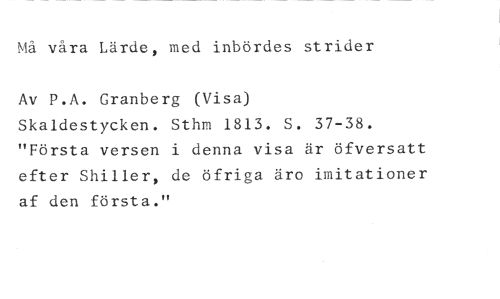 Må våra Lärde, med inbördes strider //// Av P.A. Granberg (Visa) //// Skaldestycken. Sthm 1813. S. 37-38. "Första versen i denna visa är öfversatt efter Shiller, de öfriga äro imitationer af den första."