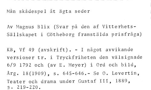 Mån skådespel åt ägta seder //// Av Magnus Blix (Svar på den af Vitterhets-Sällskapet i Götheborg framstälda prisfråga) //// KB, Vf 49 (avskrift). - I något avvikande versioner tr. i Tryckfriheten den välsignade 6/9 1792 och (av E. Meyer) i Ord och bild, Arg. 18(1909), s. 645-646.- Se 0. Levertin, //// Teater och drama under Gustaf III, 1889, s. 219-220.
