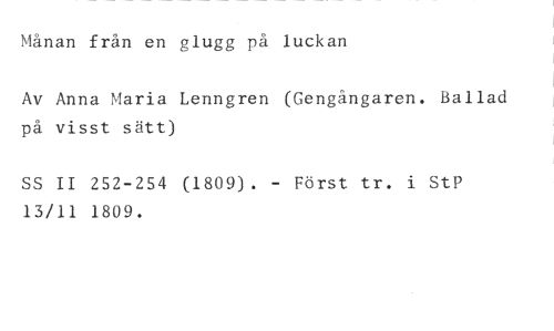 Månan från en glugg på luckan //// Av Anna Maria Lenngren (Gengångaren. Ballad på visst sätt) //// SS II 252-254 (1809). - Först tr. i StP 13/11 1809.