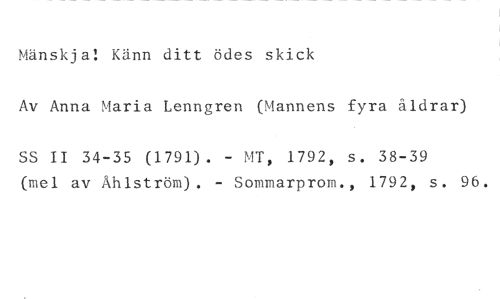 Mänskja! Känn ditt ödes skick //// Av Anna Maria Lenngren (Mannens fyra åldrar) //// SS II 34-35 (1791). - MT, 1792, s. 38-39 //// (mel av Åhlström). - Sommarprov., 1792, s. 96.