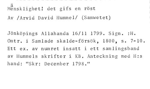 Meä nsklighet! det gifs en röst //// Av /Arvid David Hummel/ (Samwetet) //// Jönköpings Allahanda 16/11 1799. Sign. :H. Omtr. i Samlade skalde-försök, 1800, s. 7-10. Ett ex. av numret insatt i ett samlingsband av Hummels skrifter i KB. Anteckning med H:s hand: "Skr: December 1798."