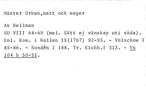 Mäster Urban,matt och mager //// Av Bellman //// SU VIII 68-69 (mel. Sätt ej vänskap uti våda). Enl. Kom. i Wallen IX(1767) 92-93. - Völschow I 85-86. - Sond6n I 148. Tr. Eichh.I 313. - Vs 104 b 50-51.