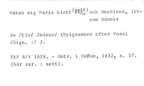 Naken mig Paris blott(gahVoch Anchises, lik- //// som Adonis //// Av /Elof Jedeur/ (Epigrammer efter Voss) /Sign. :/ J. //// StP 8/4 1828. - Omtr. i °deum, 1832, s. 57. (här var. : sett).