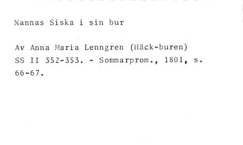 Nannas Siska i sin bur //// Av Anna Maria Lenngren (Häck-buren) //// SS II 352-353. - Sommarprom., 1801, s. 66-67.