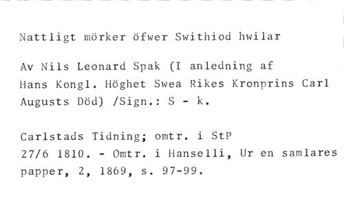 Nattligt mörker öfwer Swithiod hwilar //// Av Nils Leonard Spak (I anledning af //// Hans Kongl. Höghet Swea Rikes Kronprins Carl Augusts Död) /Sign.: S - k. //// Carlstads Tidning; omtr. i StP //// 27/6 1810. - Omtr. i Hanselli, Ur en samlares papper, 2, 1869, s. 97-99.