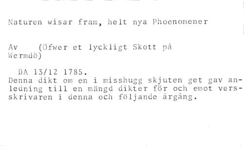 Naturen wisar fram, helt nya Phoenomener //// Av (Öfwer et lyckligt Skott på //// Wermdö) //// DA 13/12 1785. //// Denna dikt om en i misshugg skjuten get gav anledning till en mängd dikter för och emot versskrivaren i denna och följande årgång.