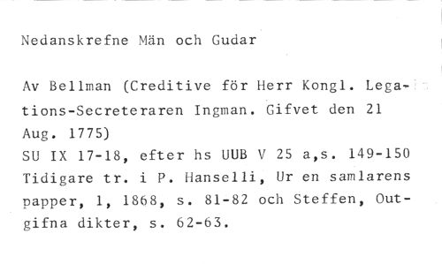 Nedanskrefne Män och Gudar //// Av Bellman (Creditive för Herr Kongl. Legations-Secreteraren Ingman. Gifvet den 21 Aug. 1775) //// SU IX 17-18, efter hs UUB V 25 a,s. 149-150 Tidigare tr. i P. Hanselli, Ur en samlarens papper, 1, 1868, s. 81-82 och Steffen, Outgifna dikter, s. 62-63.