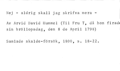 Nej - aldrig skall jag skrifva mera - //// Av Arvid David Hummel (Til Fru T, då hon firad< sin bröllopsdag, den 8 de April 1798) //// Samlade skalde-försök, 1800, s. 18-22.