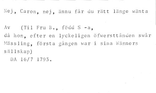 Caron, nej, ännu får du rätt länge wänta //// Av (Til Fru B., född S -a, //// då hon, efter en lyckeligen öfwersttånden swår Mässling, första gången war i sina Wänners sällskap) //// DA 16/7 1793.