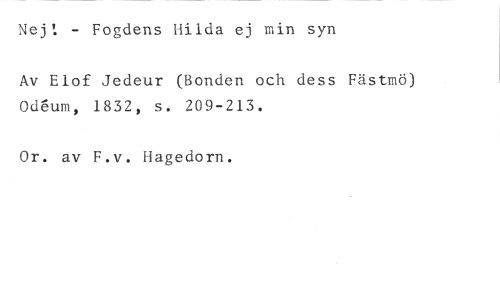 Nej: - Fogdens Hilda ej min syn //// Av Elof Jedeur (Bonden och dess Fästmö) Od6um, 1832, s. 209-213. //// Or. av F.v. Hagedorn.
