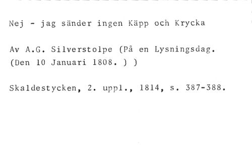 Nej - jag sänder ingen Käpp och Krycka //// Av A.G. Silverstolpe (På en Lysningsdag. (Den 10 Januari 1808. ) ) //// Skaldestycken, 2. uppl., 1814, s. 387-388.