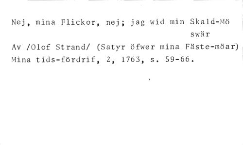Nej, mina Flickor, nej; jag wid min Skald-Mö //// swär //// Av /Olof Strand/ (Satyr öfwer mina Fäste-möar) Mina tids-fördrif, 2, 1763, s. 59-66.