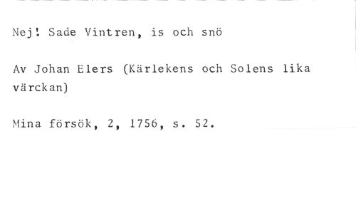 Nej: Sade Vintren, is och snö //// Av Johan Elers (Kärlekens och Solens lika värckan) //// Mina försök, 2, 1756, s. 52.