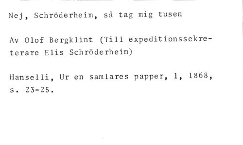 Nej, Schröderheim, så tag mig tusen //// Av Olof Bergklint (Till expeditionssekreterare Elis Schröderheim) //// Hanselli, Ur en samlares papper, 1, 1868, s. 23-25.