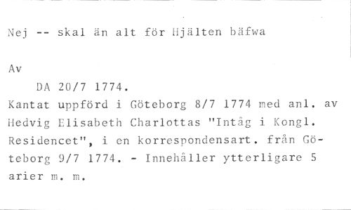 Nej -- skal än alt för Hjälten bäfwa //// Av //// DA 20/7 1774. //// Kantat uppförd i Göteborg 8/7 1774 med anl. av Hedvig Elisabeth Charlottas "Intåg i Kongl. Residencet", i en korrespondensart. från Göteborg 9/7 1774. - Innehåller ytterligare 5 arier m. m.