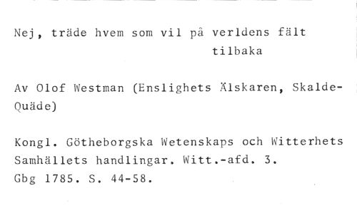 Nej, träde hvem som vil på verldens fält //// tilhaka //// Av Olof Westman (Enslighets Älskaren, SkaldeQuäde) //// Kongl. Götheborgska Wetenskaps och [Vitterhets Samhällets handlingar. Witt.-afd. 3. Gbg 1785. S. 44-58.