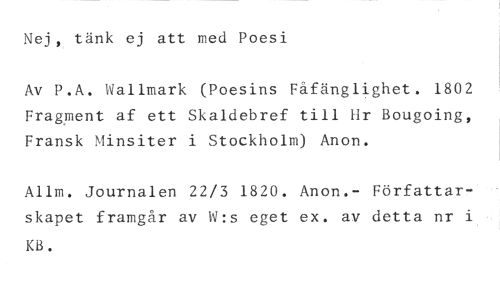 Nej, tänk ej att med Poesi //// Av P.A. Wallmark (Poesins Fåfänglighet. 1802 Fragment af ett Skaldebref till Hr Bougoing, Fransk Minsiter i Stockholm) Anon. //// Allm. Journalen 22/3 1820. Anon.- Författarskapet framgår av W:s eget ex. av detta nr i //// KB.