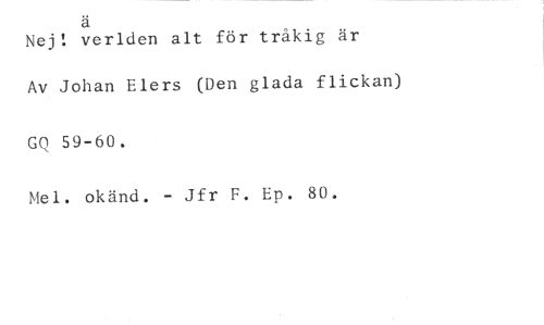 ä //// Nej! verlden alt för tråkig är //// Av Johan Elers (Den glada flickan) //// GO, 59-60. //// Diel. okänd. - Jfr F. Ep. 80.