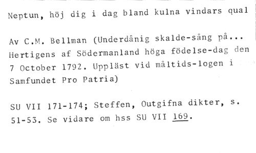 Neptun, höj dig i dag bland kulna vindars quai //// Av C.M. Bellman (Underdånig skalde-sång på... Hertigens af Södermanland höga födelse-dag den 7 October 1792. Upplåst vid måltids-logen i Samfundet Pro Patria) //// SU VII 171-174; Steffen, Outgifna dikter, s. 51-53. Se vidare om hss SU VII 169.