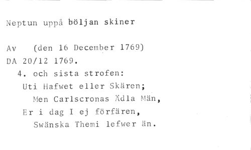 Neptun uppå böljan skiner //// Av (den 16 December 1769) //// DA 20/12 1769. //// 4. och sista strofen: //// Uti Hafwet eller Skären; //// Men Carlscronas Ädla Män, Er i dag I ej förfären, //// Swänska Themi lefwer än.