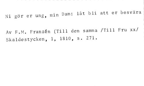 Ni gör er ung, min Dam: låt bli att er besvära //// Av F.M. Franzén (Till den samma /Till Fru xx/ Skaldestycken, 1, 1810, s. 271.