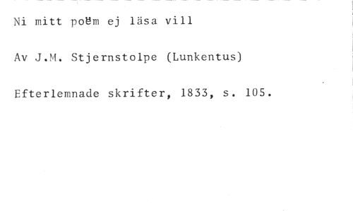 Ni mitt poem ej läsa vill //// Av j. . Stjernstolpe gunkentus) Efterlemnade skrifter, 1833, s. 105.