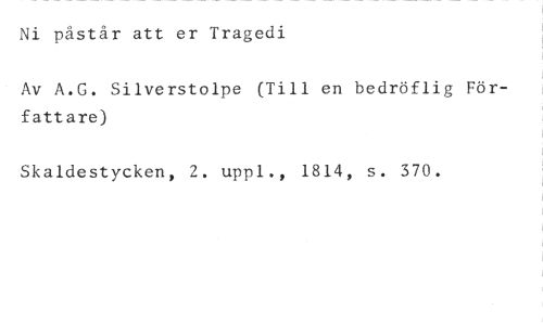 Ni påstår att er Tragedi //// Av A.G. Silverstolpe (Till en bedröflig Författare) //// Skaldestycken, 2. uppl., 1814, s. 370.