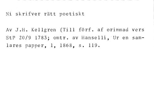 Ni skriver rätt poetiskt //// Av J.H. Kellgren (Till förf. af orimmad vers StP 20/9 1783; omtr. av Hanselli,'Ur en samlares papper, 1, 1868, s. 119.