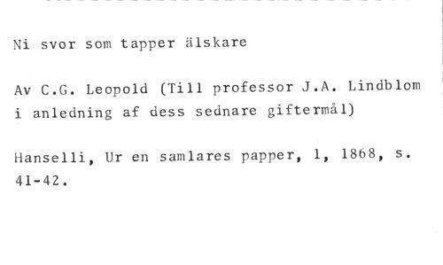 Ni svor som tapper älskare //// Av C.G. Leopold (Till professor J.A. Lindblom i anledning af dess sednare giftermål) //// Hanselli, Ur en samlares papper, 1, 1868, s. 41-42.
