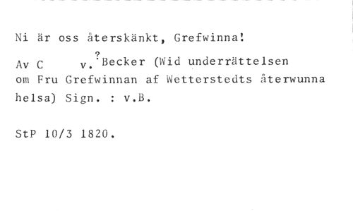 Ni är oss återskänkt, Grefwinna! //// Av C v. Becker (Wid underrättelsen //// om Fru Grefwinnan af Wetterstedts återwunna helsa) Sign. : v.B. //// StP 10/3 1820.