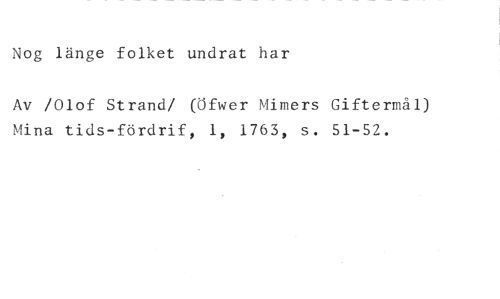 Nog länge folket undrat har //// Av /Olof Strand/ (Öfwer Mimers Giftermål) Mina tids-fördrif, 1, 1763, s. 51-52.