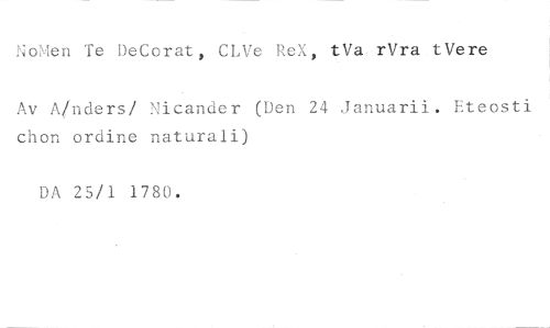 NoMen Te DeCorat, CLVe ReX, tVa rVra tVere //// Av A/nders/ Nicander (Den 24 Januarii. Eteosti chon ordine naturali) //// DA 25/1 1780.